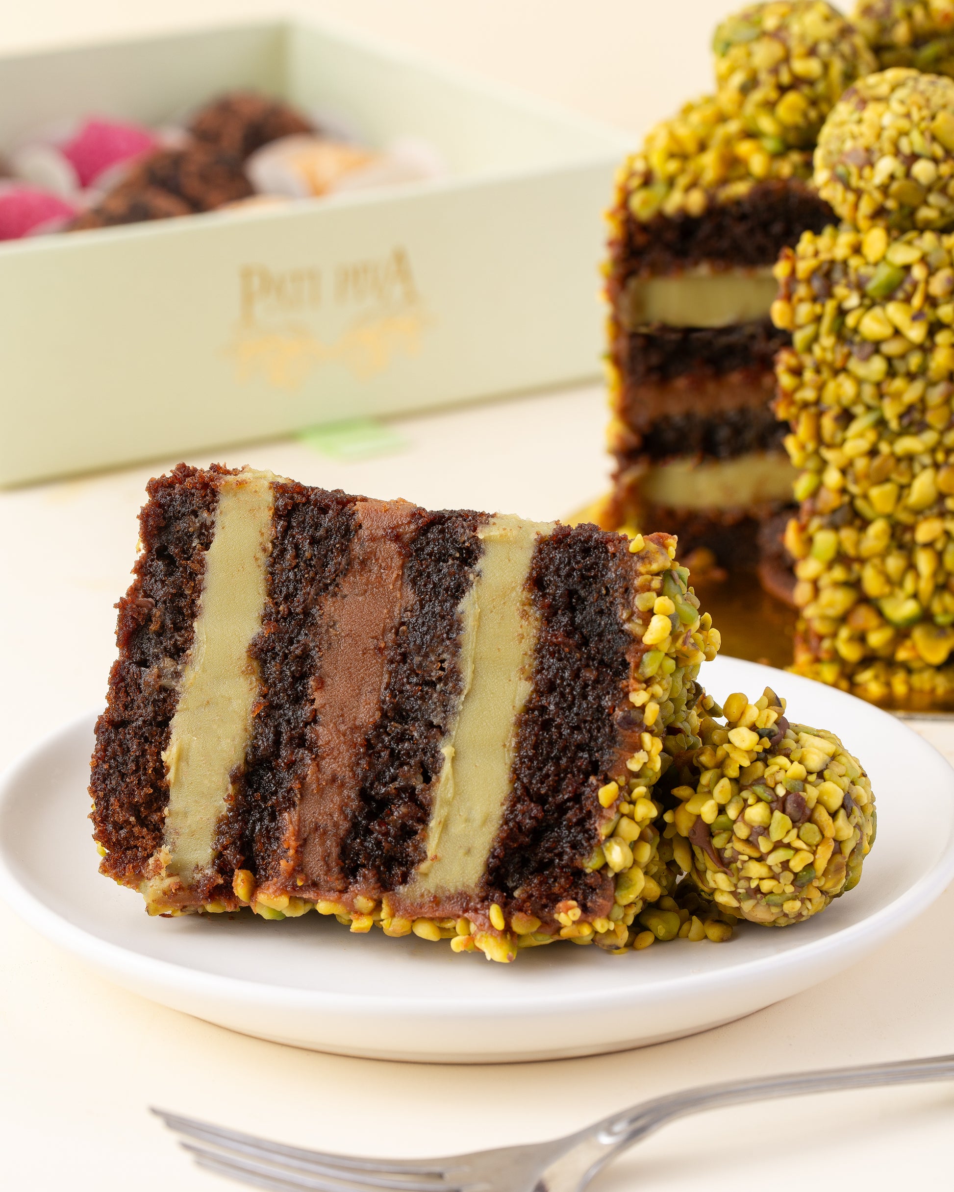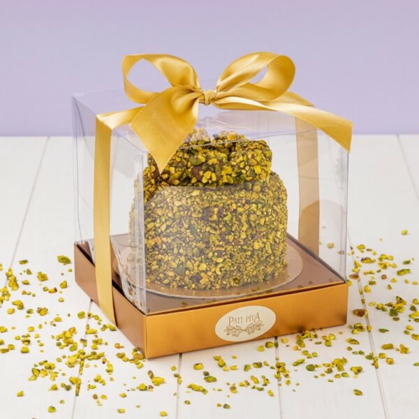 Bolo na caixa dourada com tampa de acetato tradicional Pati Piva, com recheio de brigadeiro de pistache e brigadeiro tradicional, envolto em pistaches triturados. Decorado com brigadeiros de pistache no topo (brigadeiros tradicionais envoltos em pistache triturado). Acompanha uma vela do tipo foguete, que pode variar entre dourado, prateado, vermelho ou azul. Serve aproximadamente 6 pessoas.