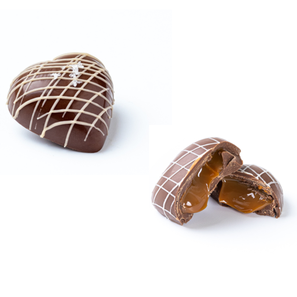 Bombom coração com recheio de caramelo e flor de sal. Combinação perfeita de sabores.