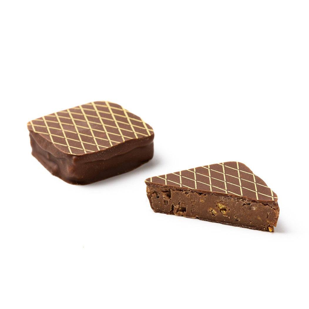 Irresistível bombom de praliné de avelã. Crocância e sabor intenso em cada mordida.