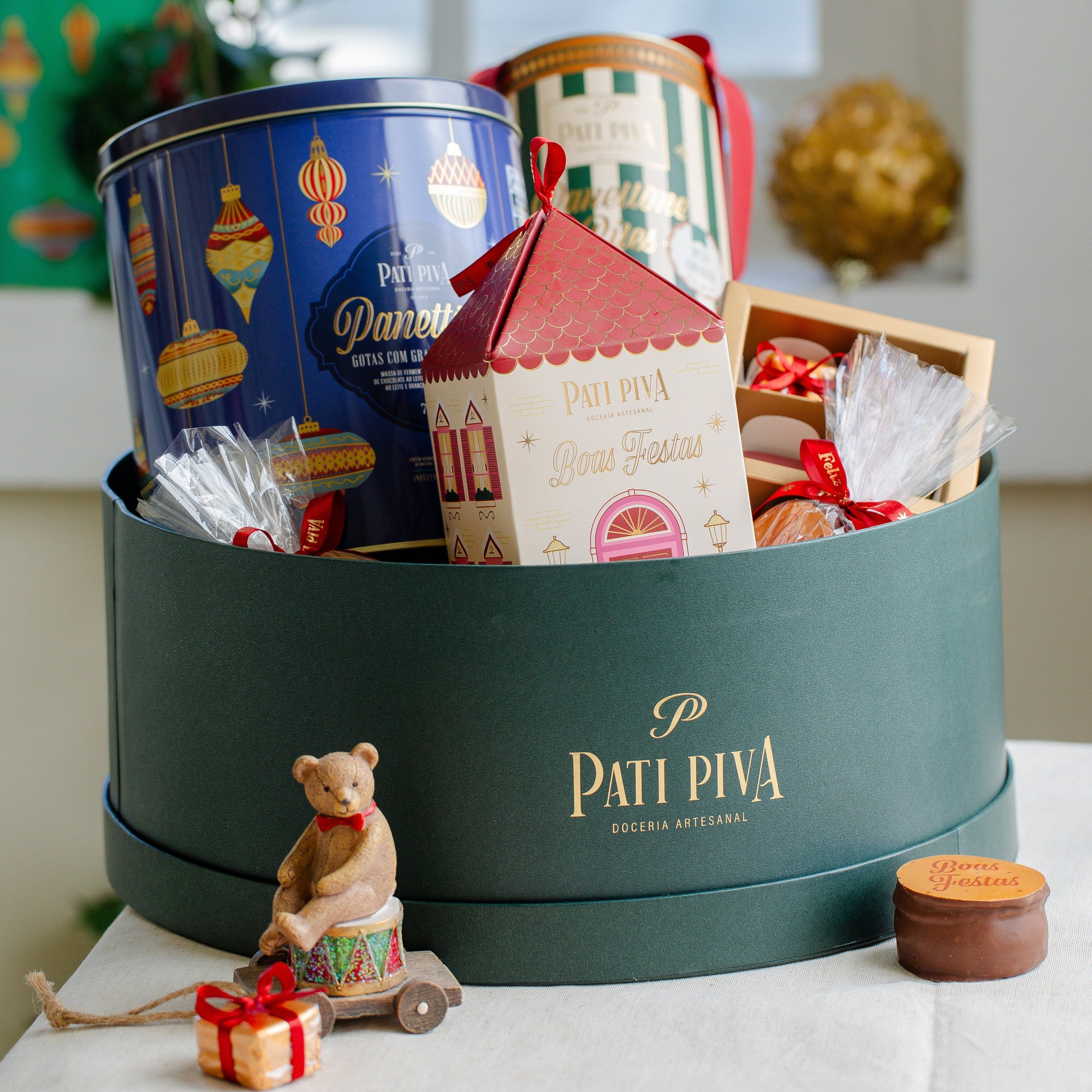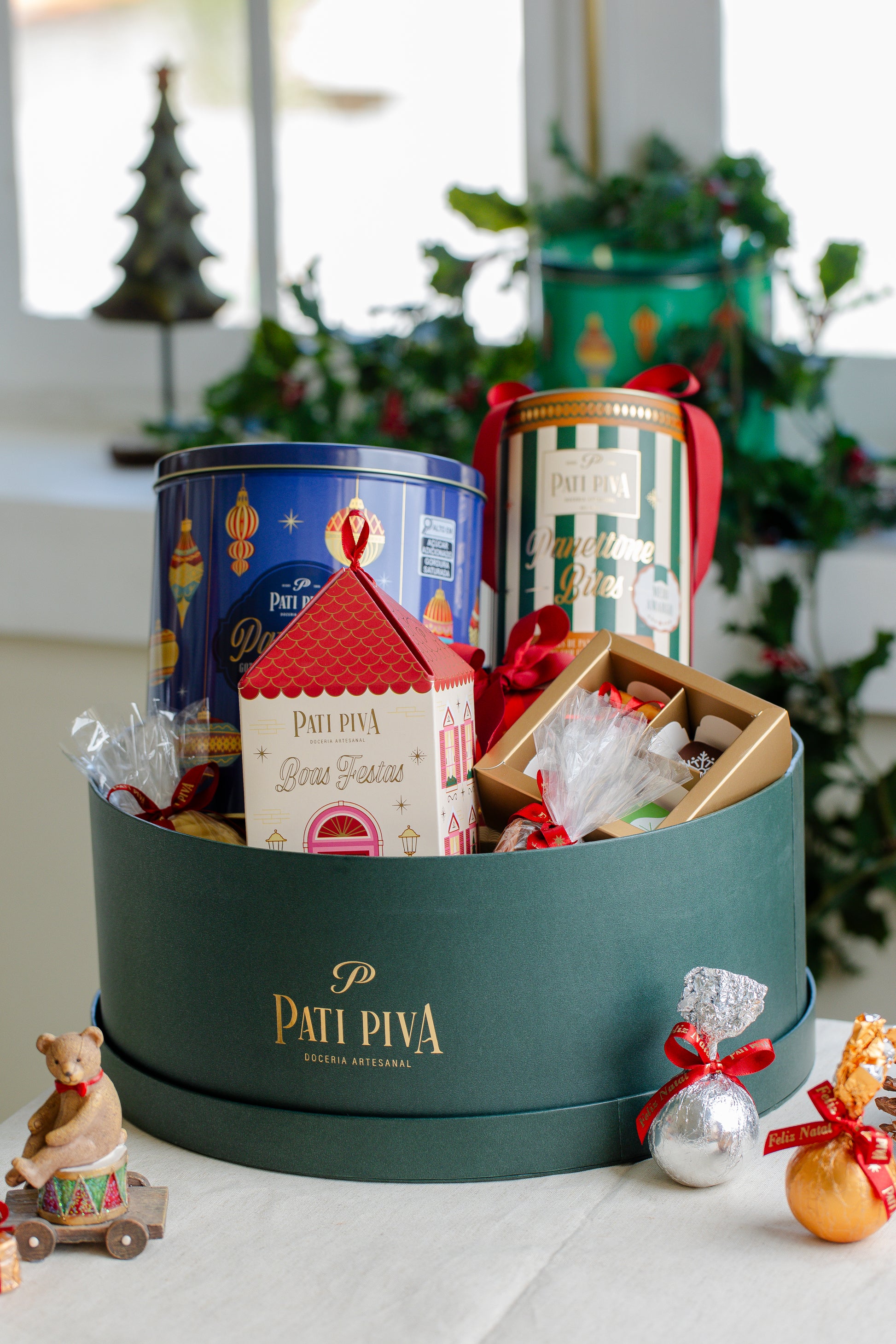 A Cesta Redonda Verde – Especial de Natal reúne uma seleção exclusiva de produtos natalinos da Pati Piva. Elegante e completa, é ideal para surpreender com charme e sofisticação.