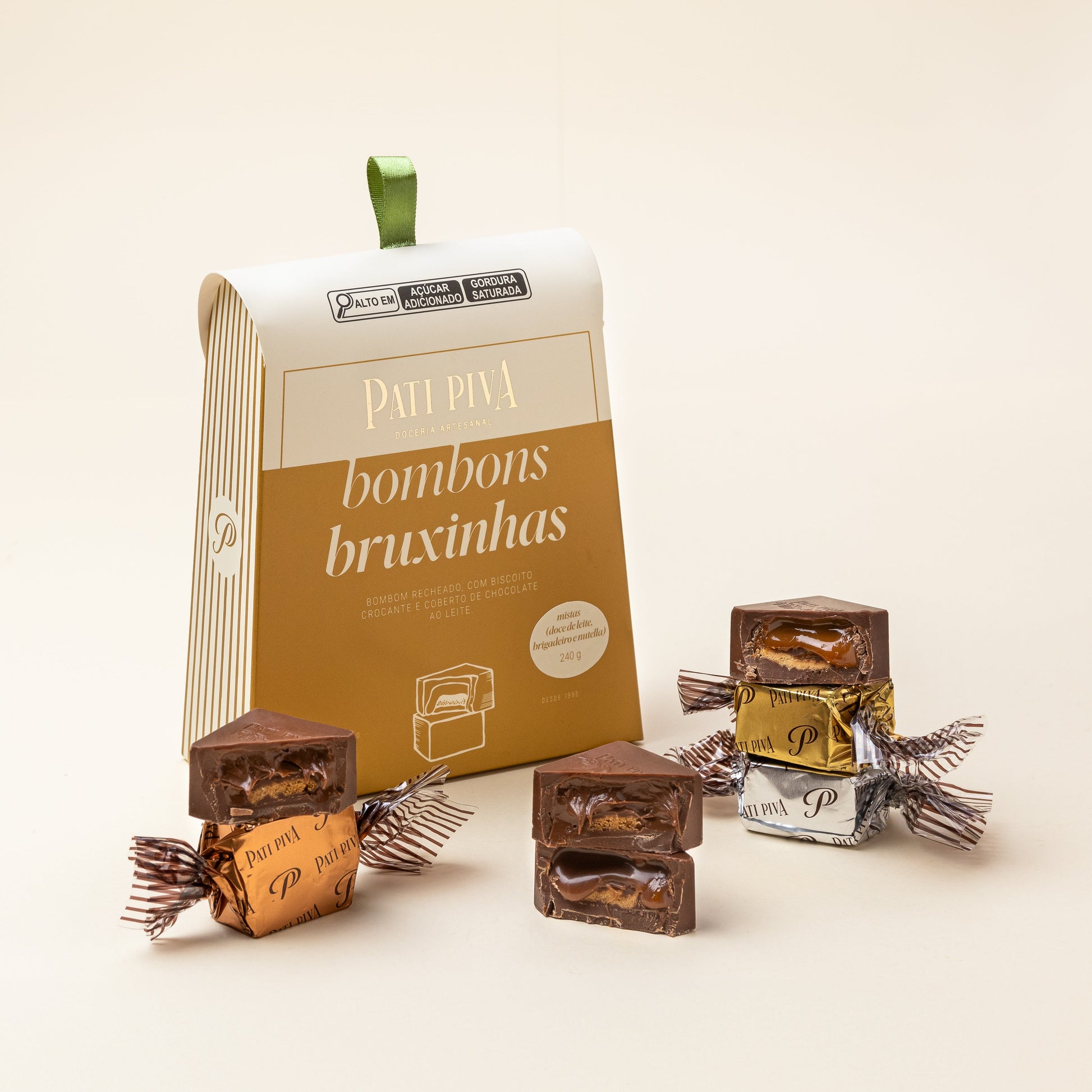 12 bruxinhas de brigadeiro: bombom com recheio cremoso, biscoito crocante e cobertura de chocolate ao leite.