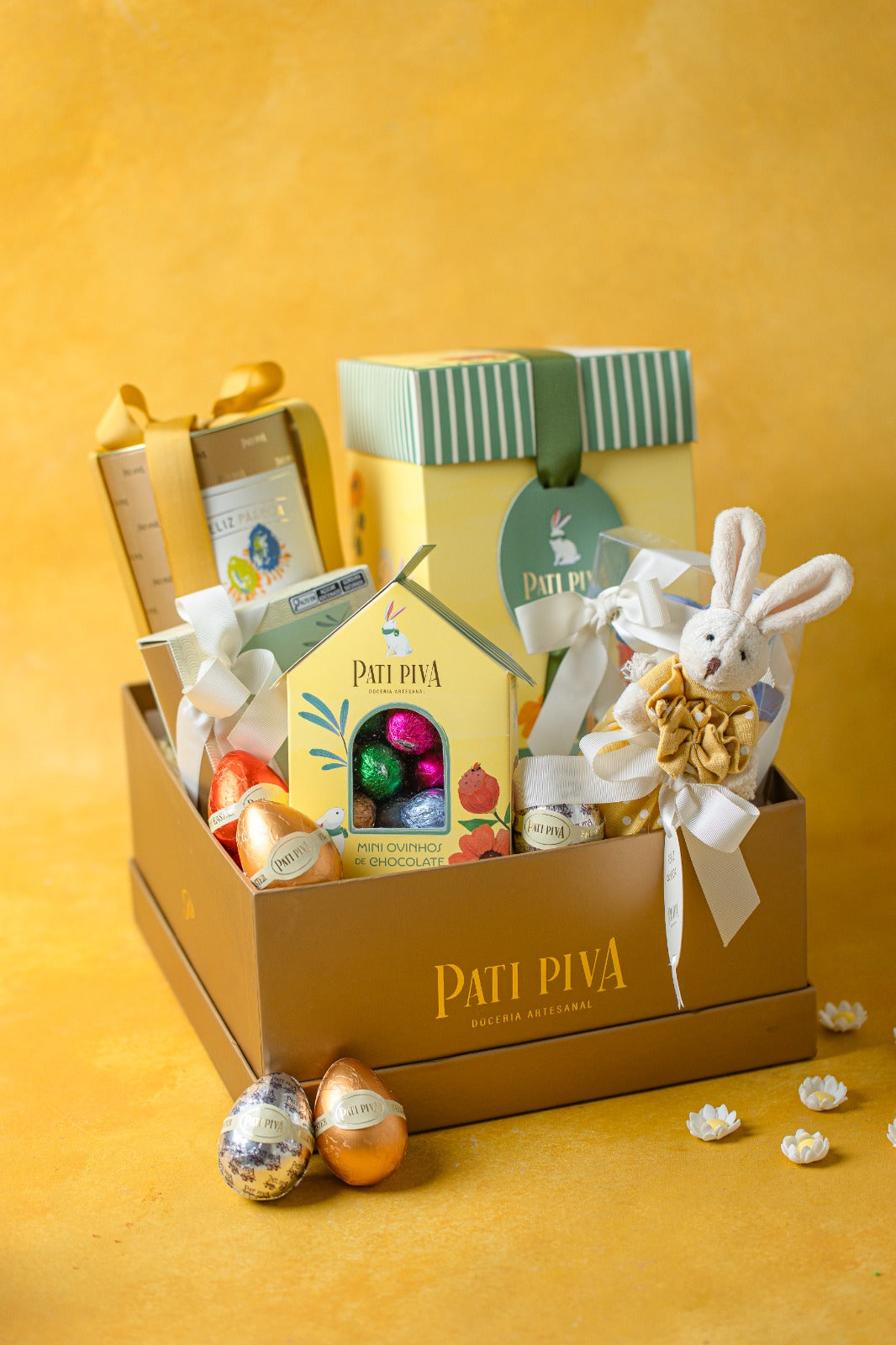 A Cesta de Páscoa Quadrada M da Pati Piva é uma seleção sofisticada e abundante de chocolates artesanais, criada para transformar a Páscoa em um momento inesquecível.