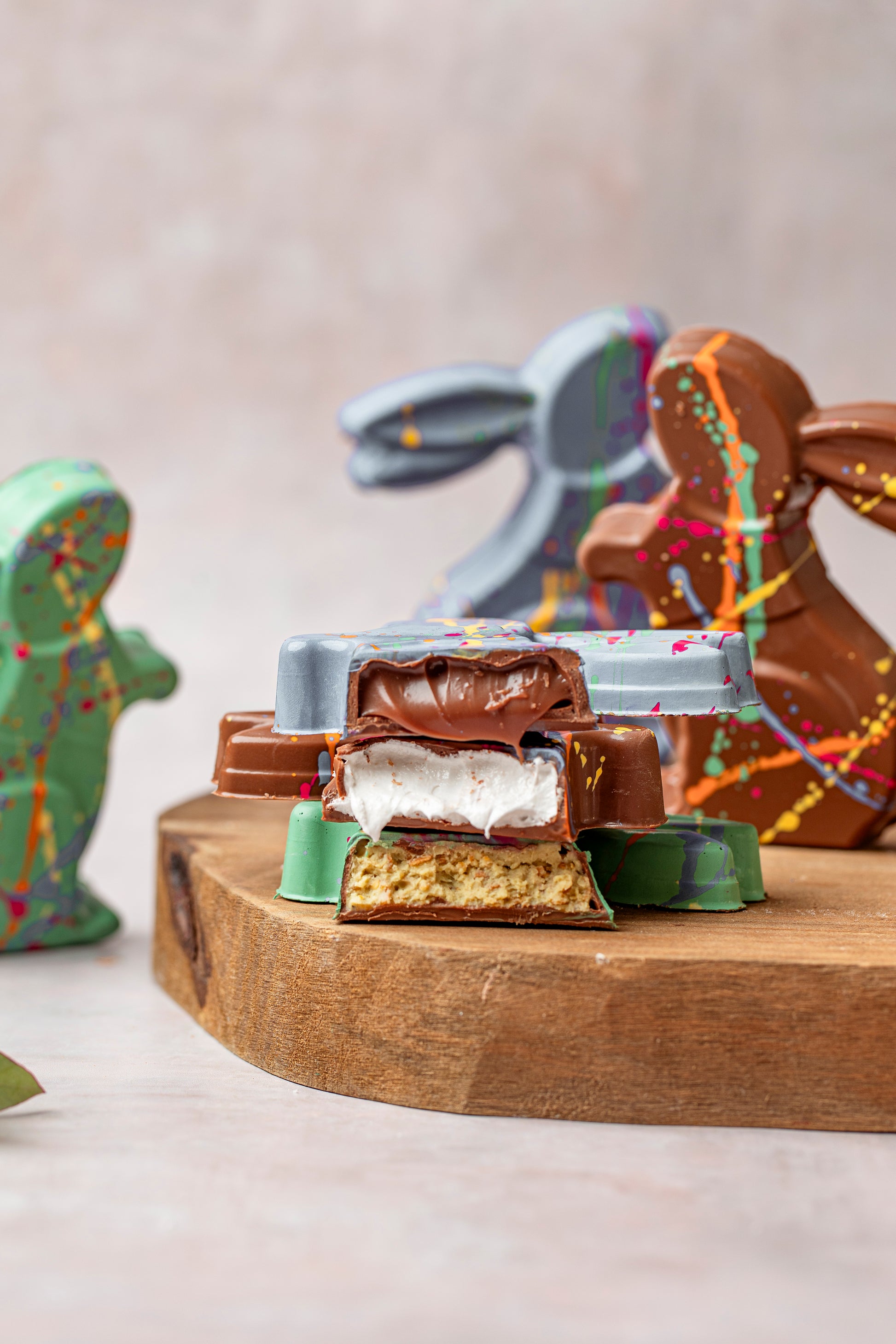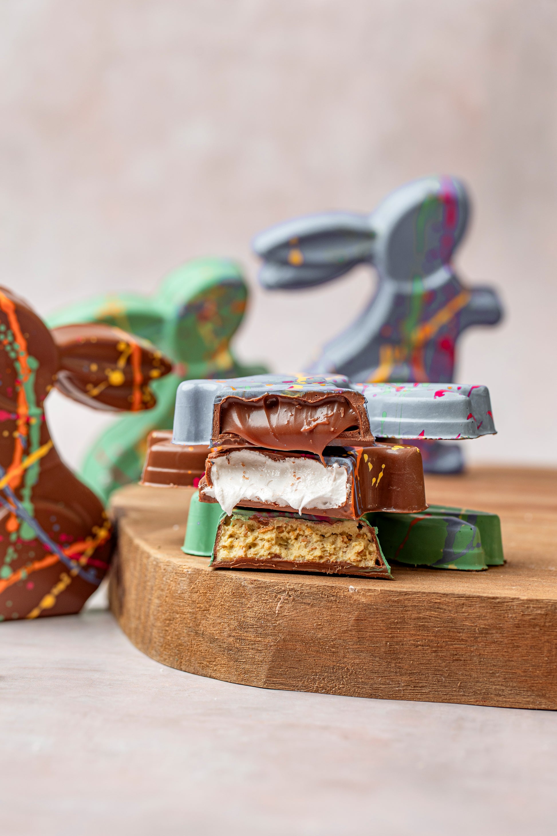Coelho de chocolate ao leite com pintura estilo artsy e recheio de pistache crocante. Criativo, sofisticado e irresistível.