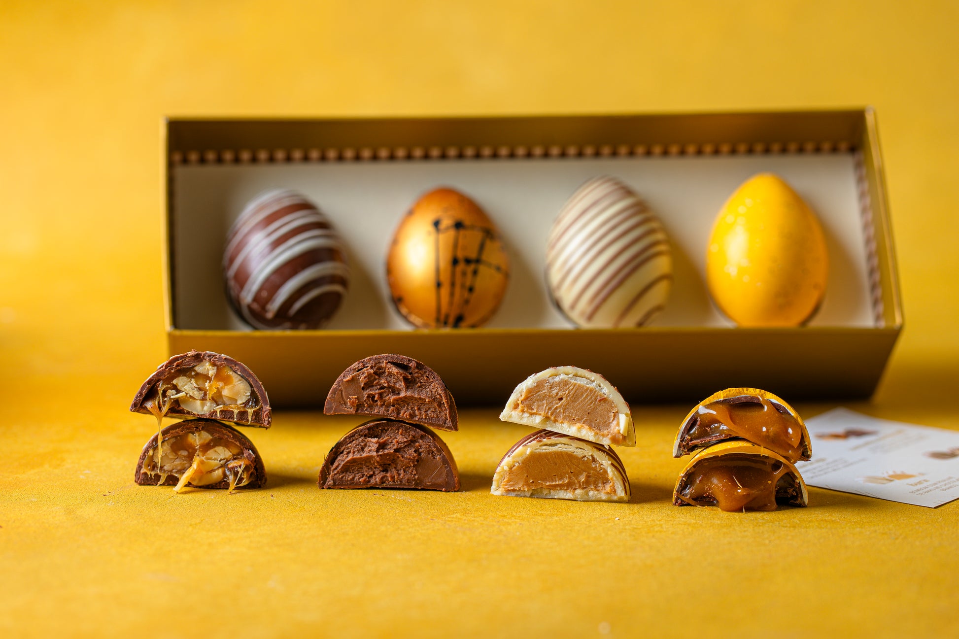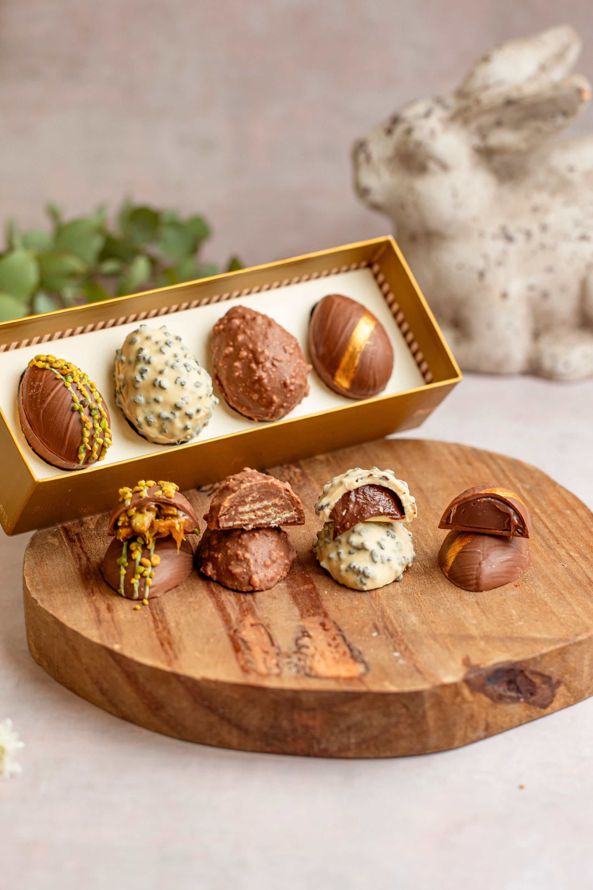 Uma combinação sofisticada, perfeita para presentear ou para quem deseja explorar diferentes sabores do chocolate artesanal em uma experiência completa de Páscoa.