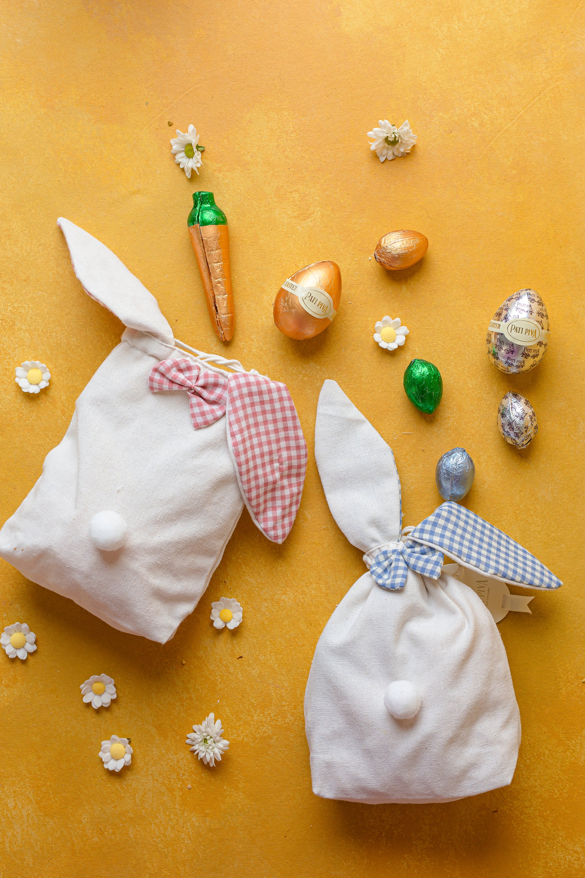 Saquinho com orelhinhas de coelho recheado com cenoura maltine, ovos de galinha e ovinhos sortidos.