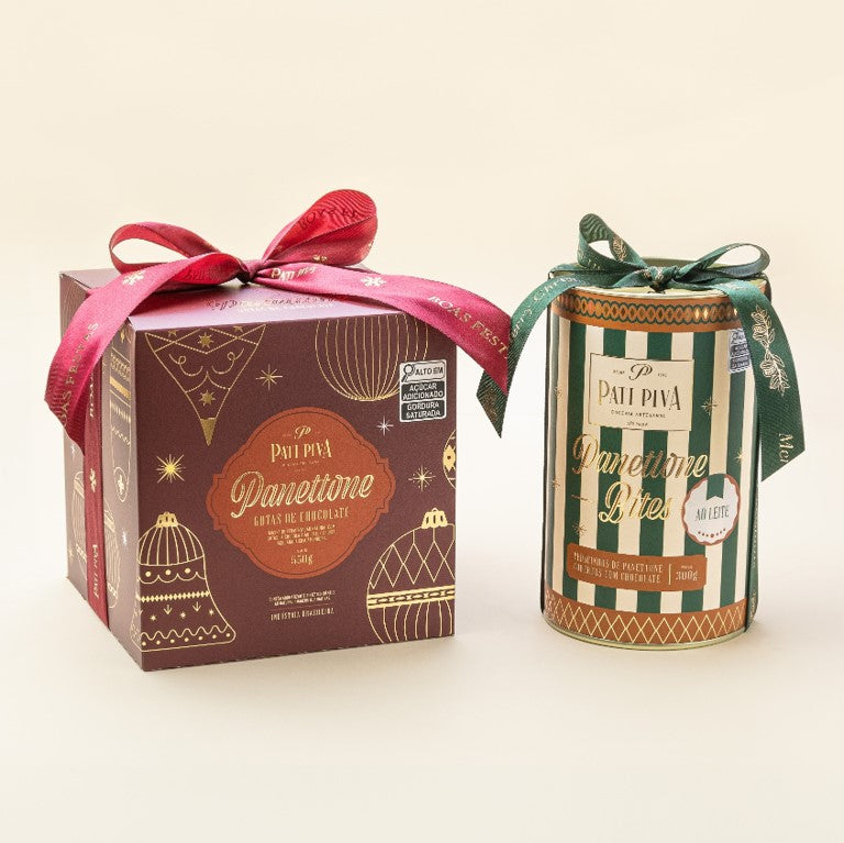 Panettones Gotas na Caixa e Bites ao Leite Pati Piva. Criado para encantar em qualquer ocasião, este combo combina o clássico Panettone de Gotas — macio, perfumado e repleto de gotas de chocolate ao leite — com os irresistíveis Bites ao Leite, pequenas explosões de sabor com o chocolate característico da Pati Piva.