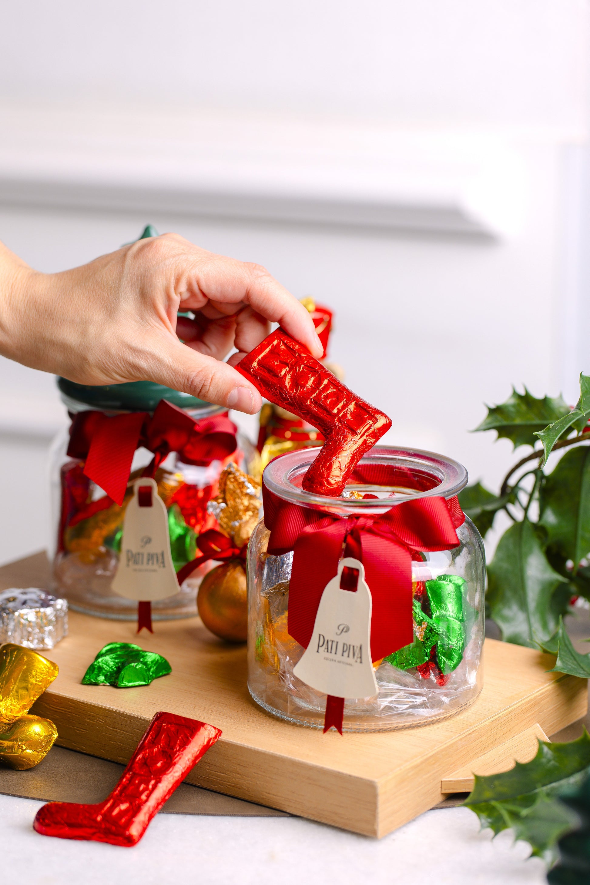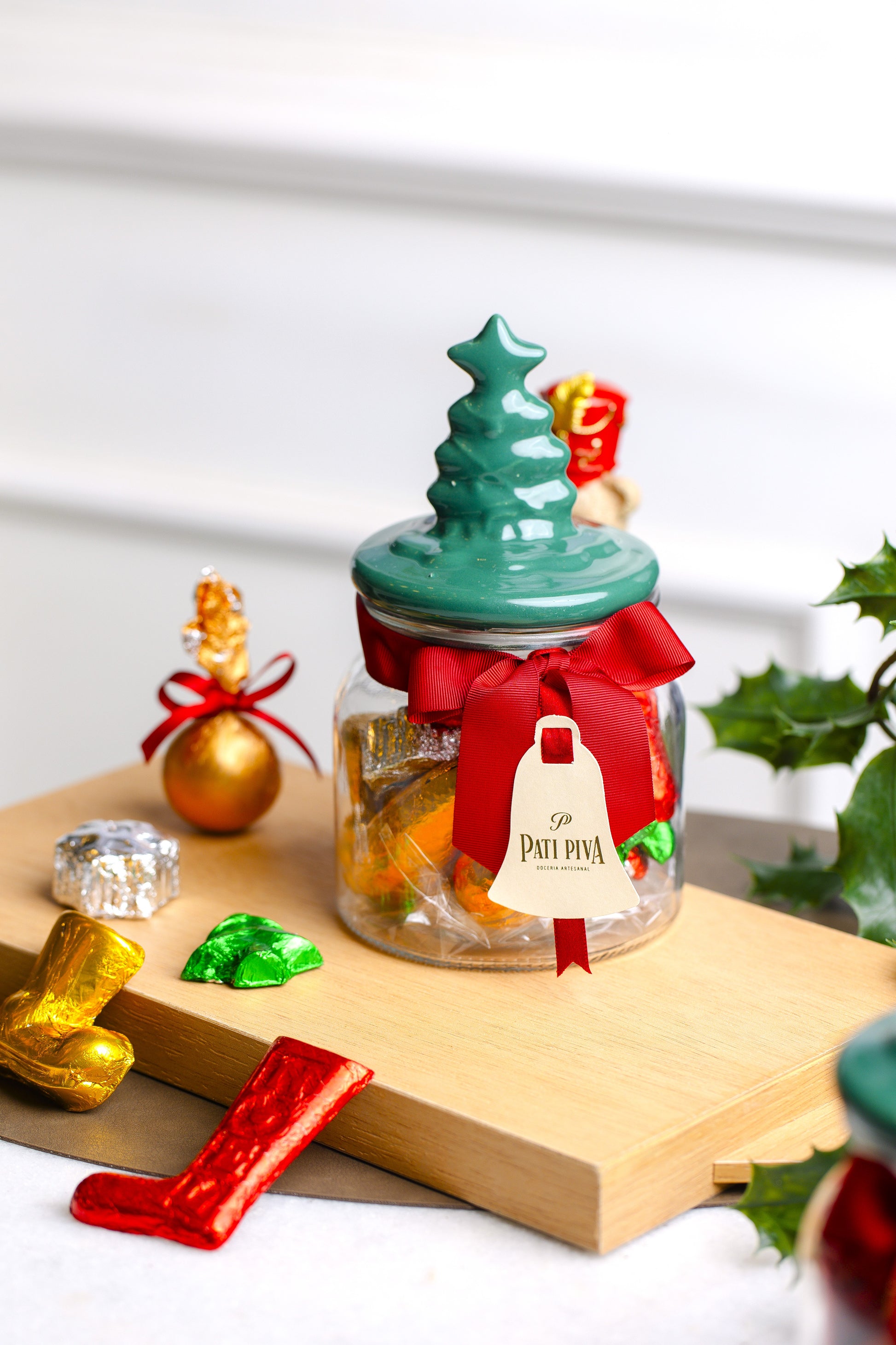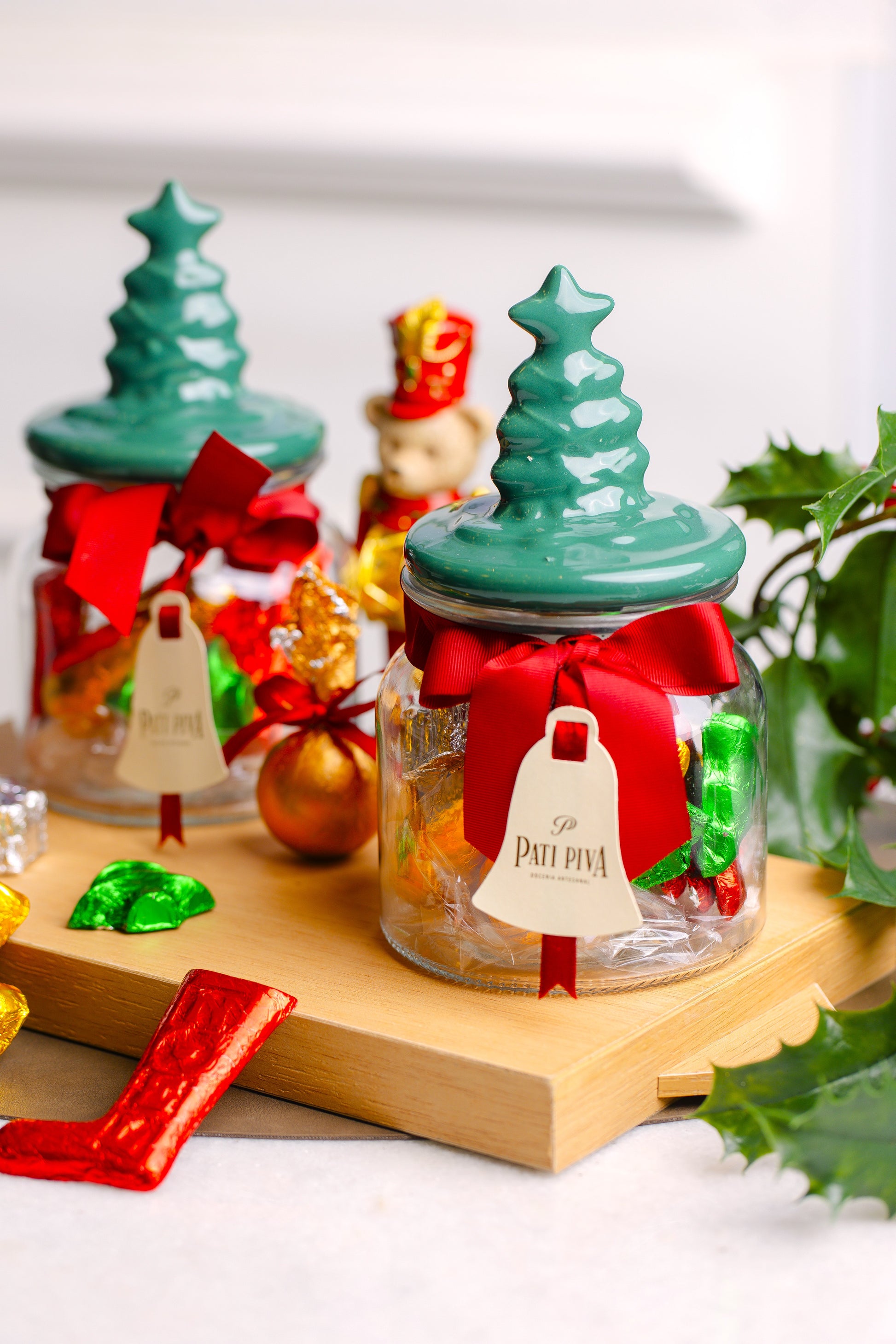 Este pote de vidro com tampa em formato de árvore de Natal verde traz um mix irresistível de bombons artesanais nos sabores: