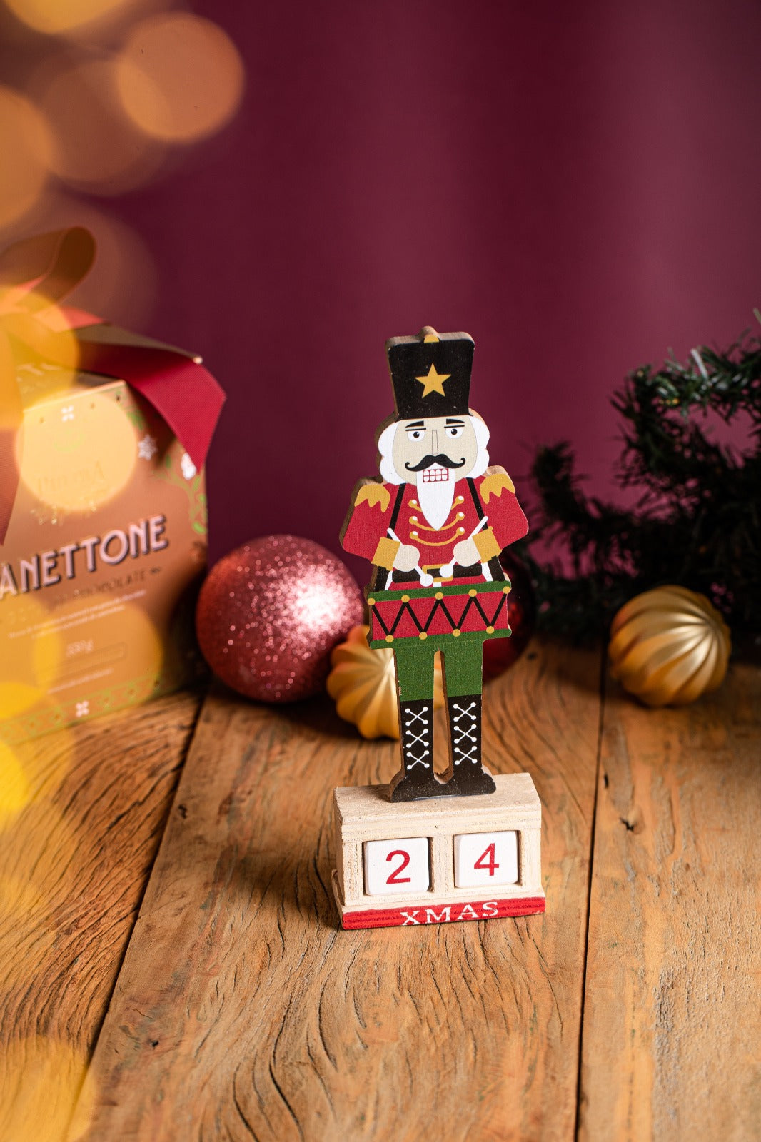 Um boneco quebra nozes decorativo, contendo 2 dadinhos com números, para você utilizar como um calendário e acompanhar a chegada no Natal! Produto decorativo, não comestível.