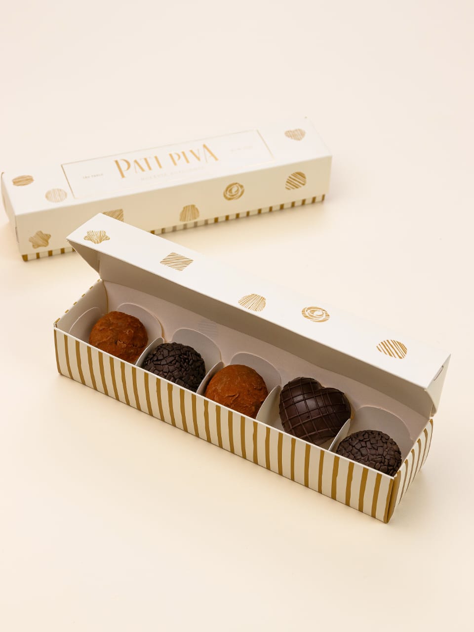 Uma elegante embalagem em forma de tubete, com a tampa transparente, contendo 5 unidades dos deliciosos docinhos meio amargo da Pati Piva.