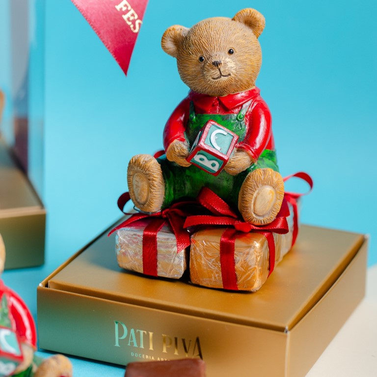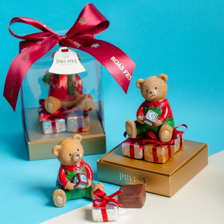 Acompanha um ursinho de pelúcia cheio de charme, perfeito para guardar como lembrança especial, e deliciosos waffers presentinho de Natal, preparados com o chocolate artesanal da Pati Piva.