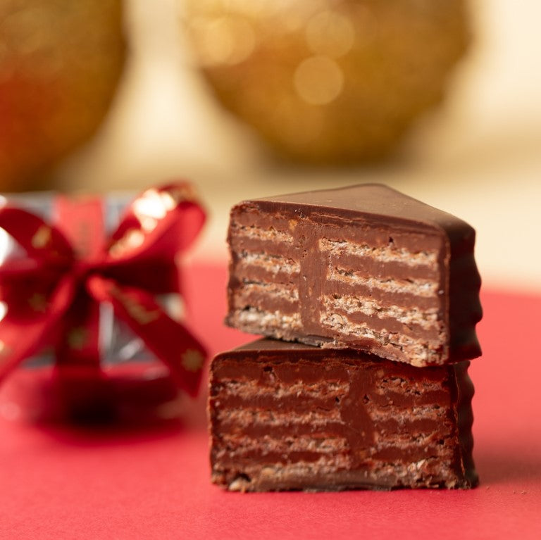 O Waffer Presentinho Meio Amargo é um mimo natalino sofisticado. Um waffer crocante de chocolate meio amargo, recheado com cremoso gianduia de avelãs, cuidadosamente embalado como um presentinho de Natal.
